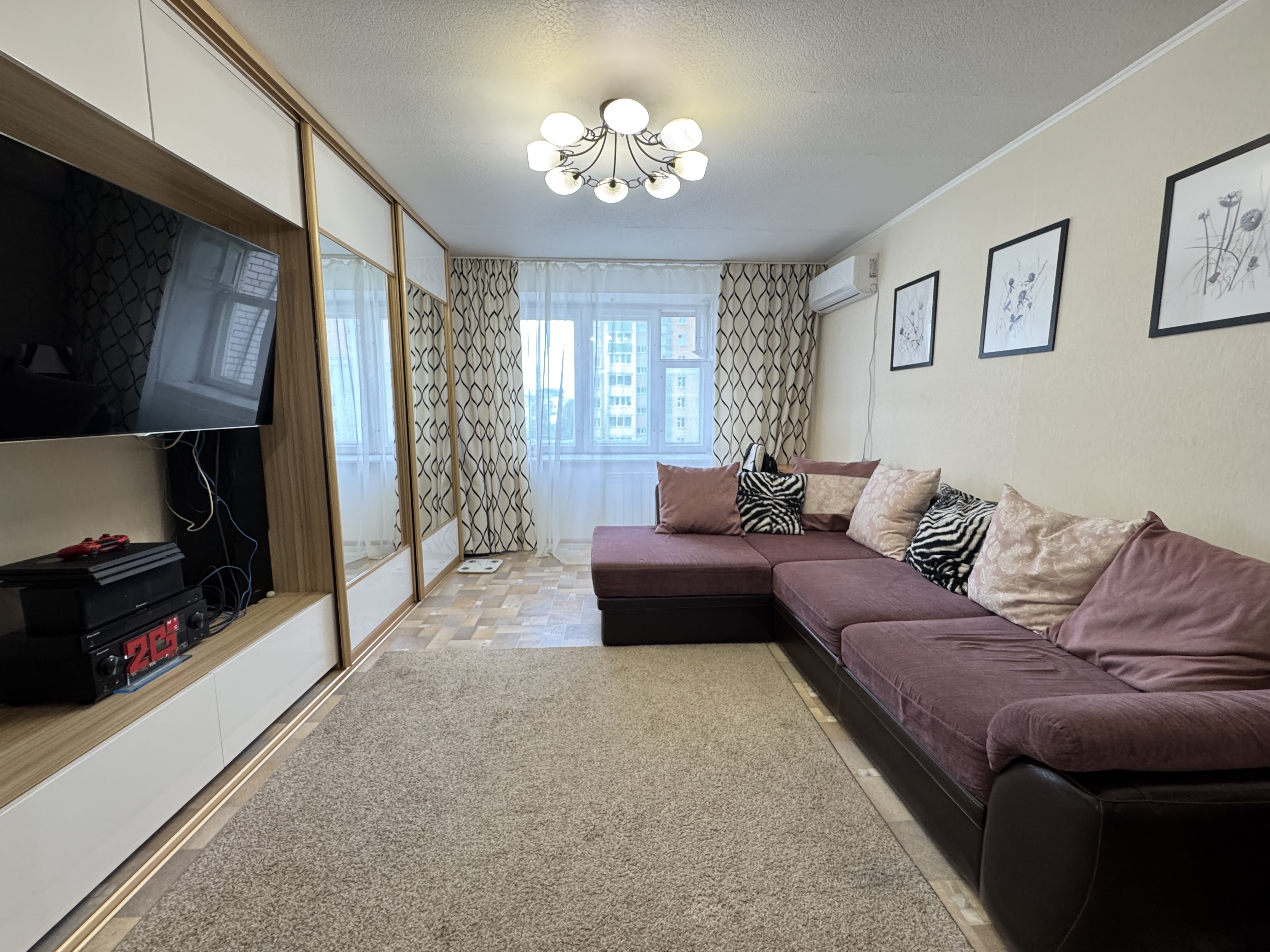 Общий метраж 40,30м2, кухня 8,3 м2, комната 16,9 м2 есть застекленная витражная лоджия 3,3м2 из кухни. Санузел раздельный. 10/10 этаж. Выше полноценный тех этаж. Вид из окон: на разные стороны. Улучшенная новая входная дверь. Ремонт сделан для себя.