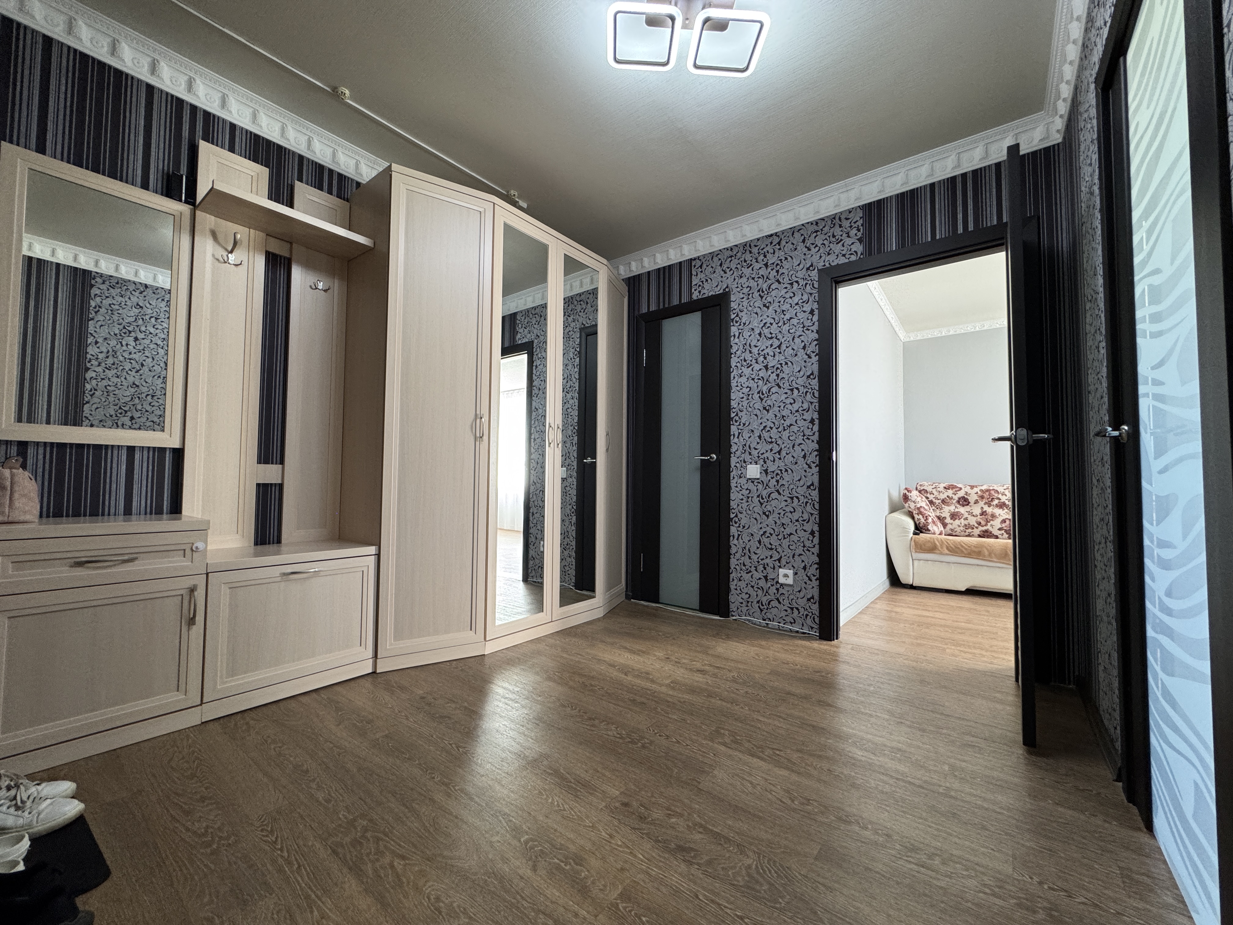 Общий метраж 50.5 кв.м., кухня 11 м2, комната 24м2. Застекленная лоджия из кухни 5м2. Санузел совмещен. Отдельная гардеробная. Вид из окон: на улицу. Улучшенная входная дверь. Этаж 6/10.